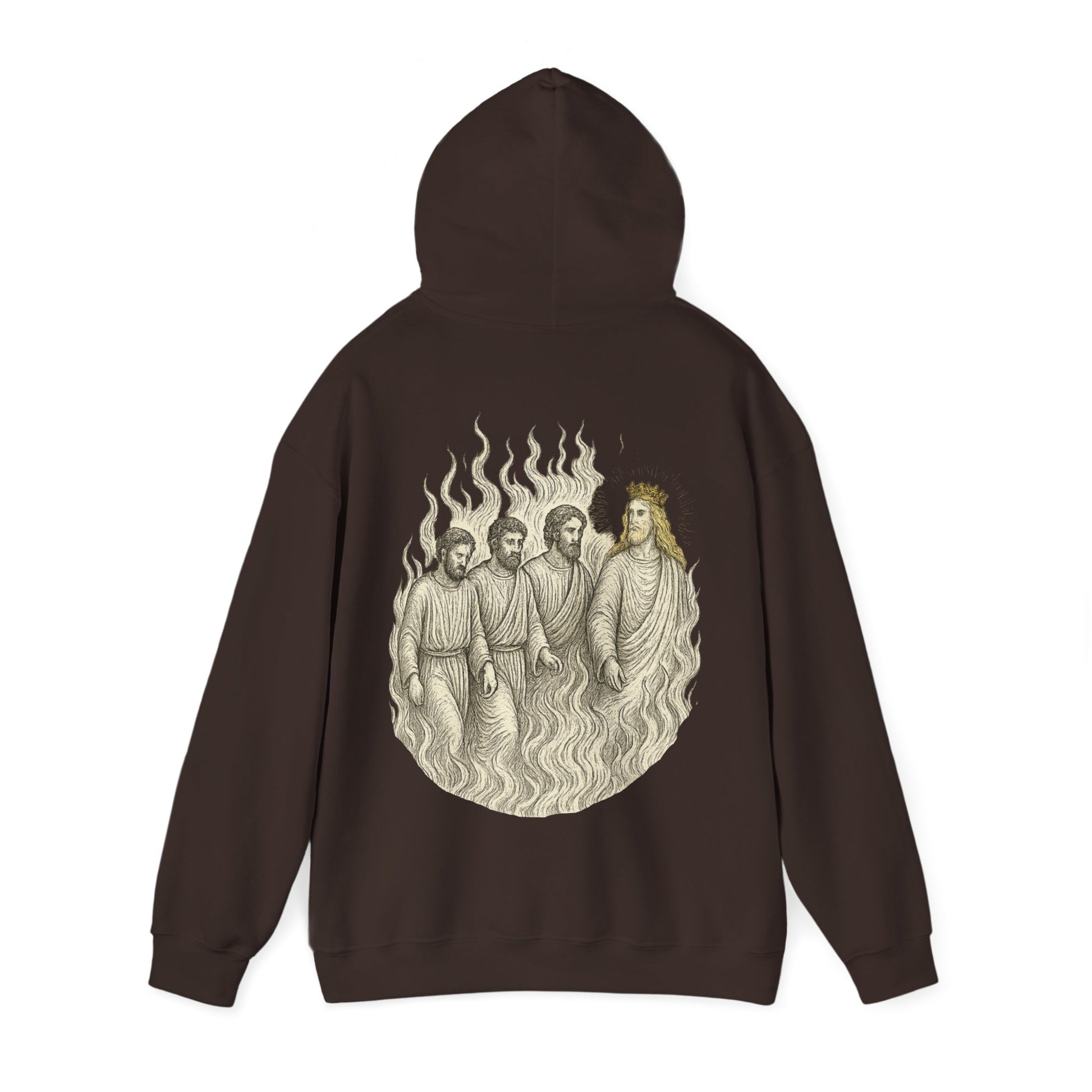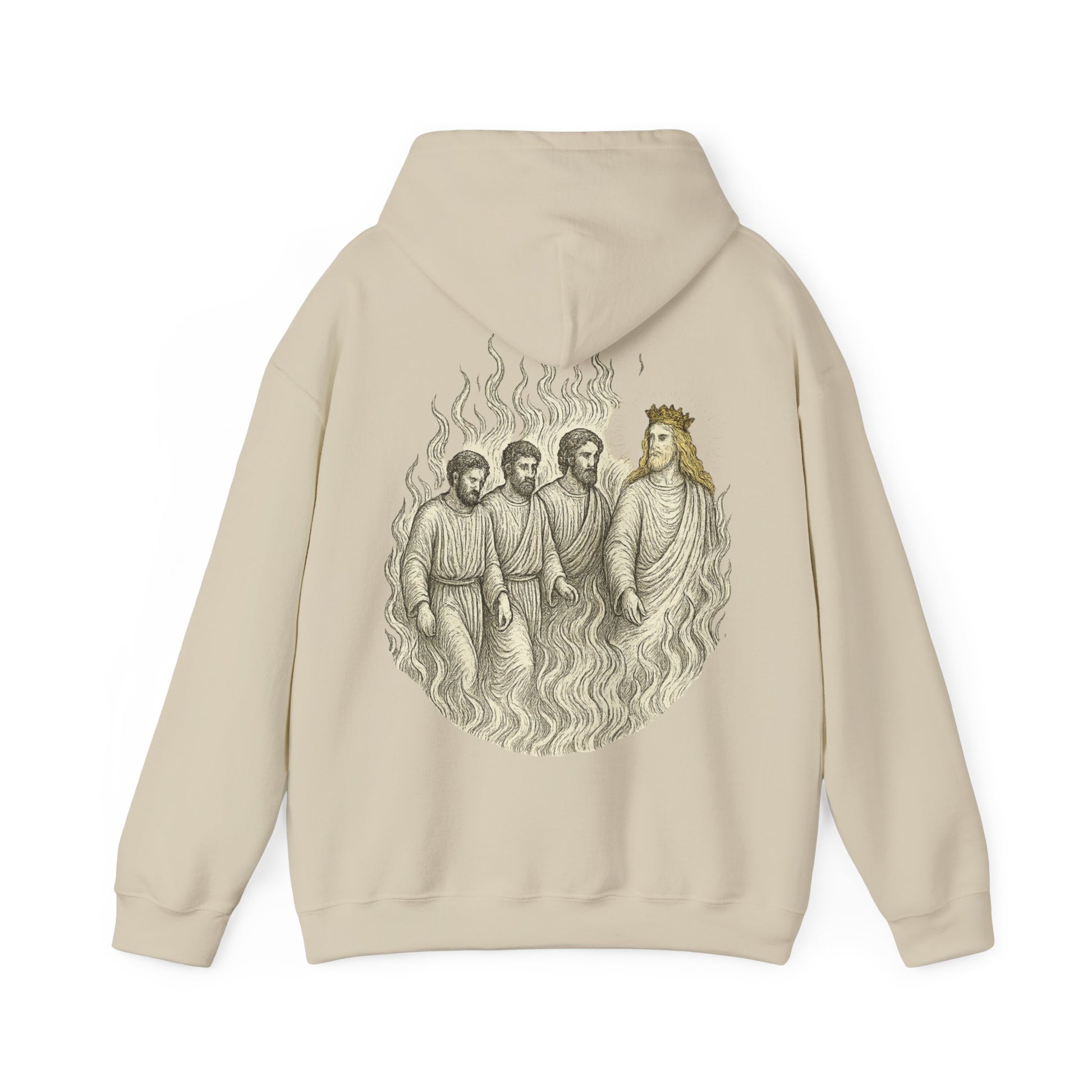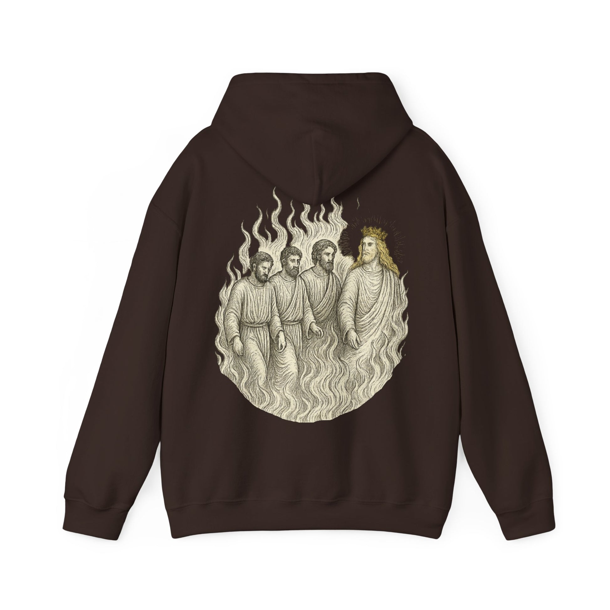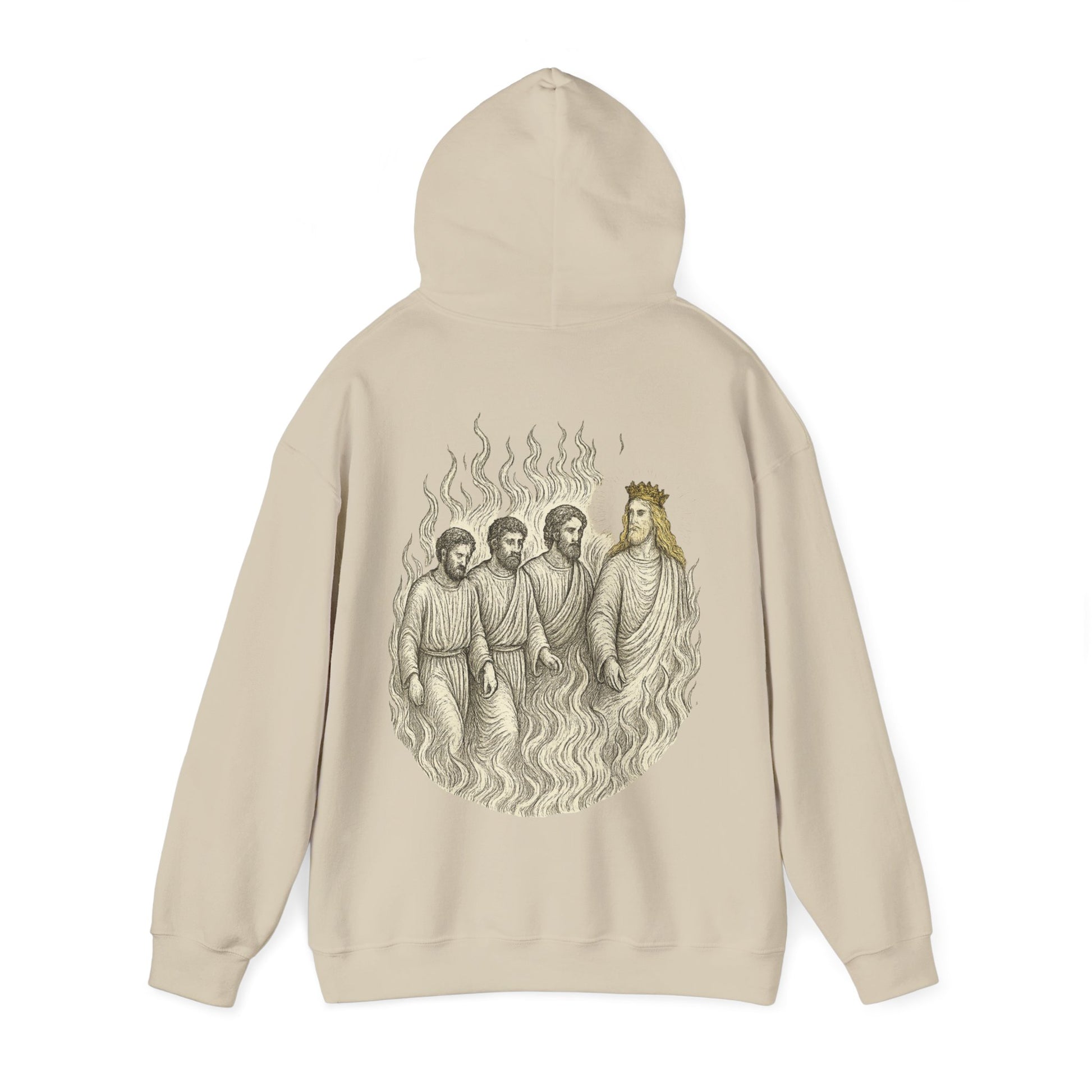 A hoodie featuring a design inspired by the Daniel 3 scene. Perfect for those who love meaningful and prophetic clothing. Ideal for church events, and everyday wear for adults.